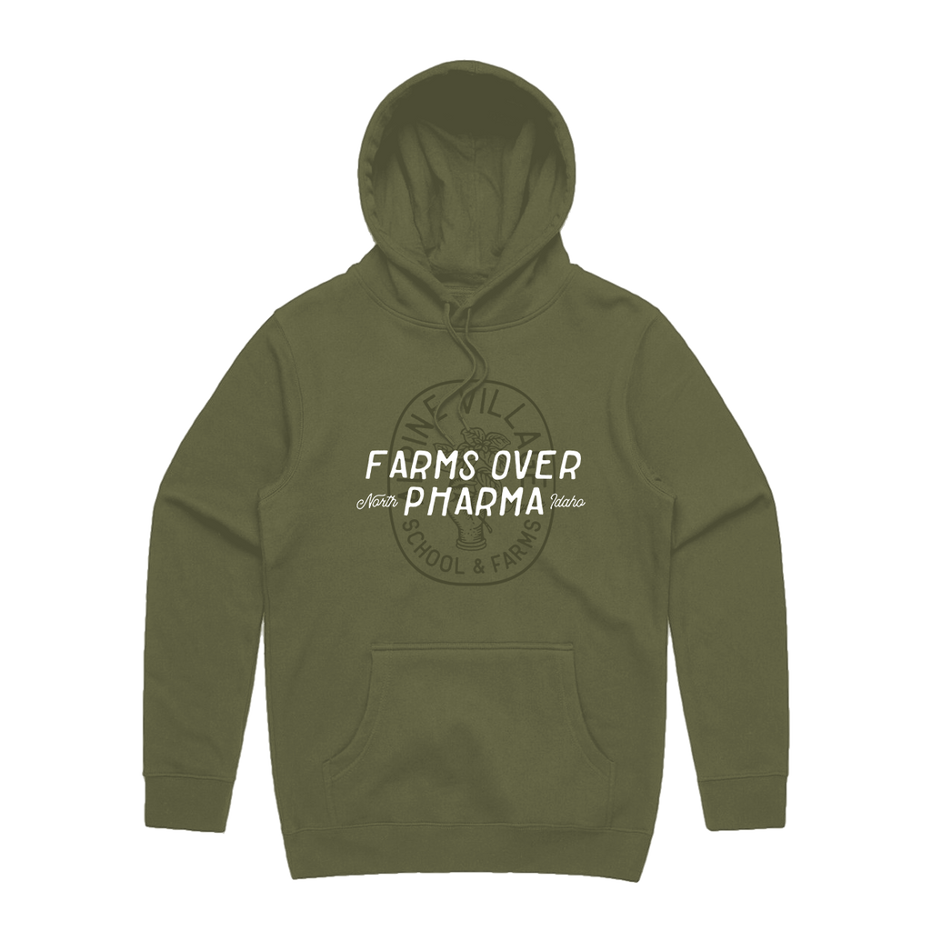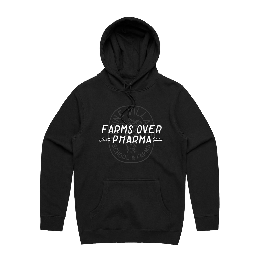 Alpine Village School & Farms - Farms Over Pharma Trucker Hat in white with black/white embroidered design.