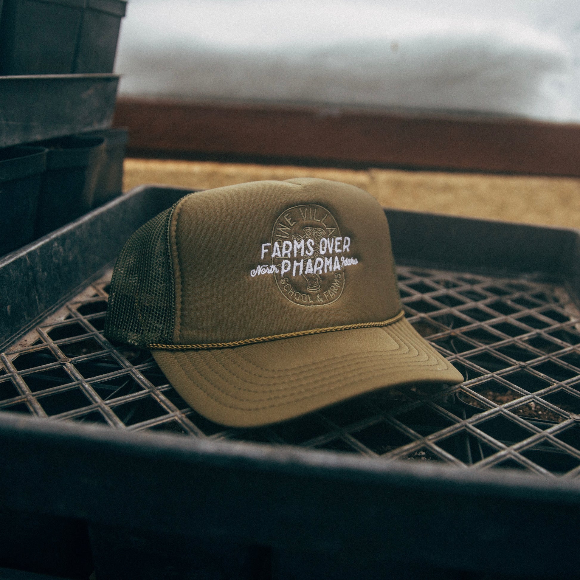 Farms Over Pharma Embroidered Trucker Hat in Army Green